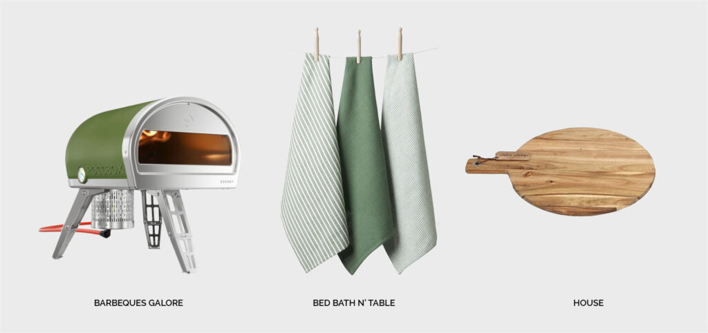 Product: Barbeques Galore Gozney Roccbox Portable Pizza Oven $799, Bed Bath N’ Table Morgan & Finch Yarn Dye Tea Towel Set of 3 $14.95, House Alex Liddy Acacia Board $79.99.