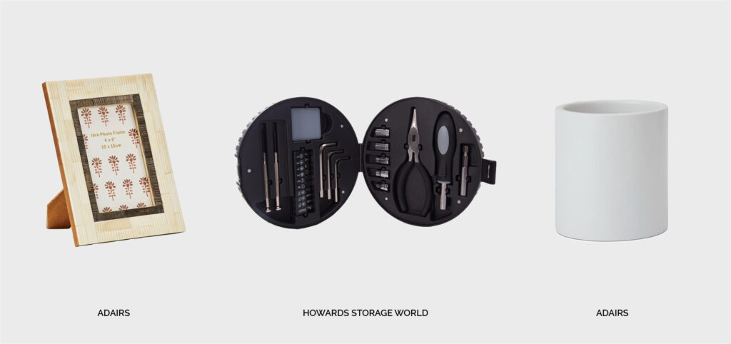 Product: Adairs Idra Photo Frame $39.99, Adairs Stark Matte Large Pot $59.99, Howards Storage World IS Gift The Auto Collection 24 Piece Tool Set $29.95.